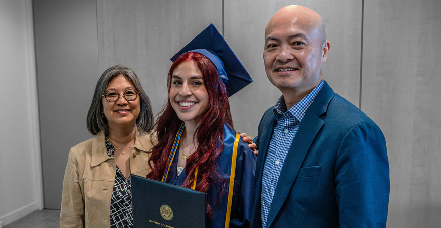 UC Merced donors Cheryl Matsubara and Dar Chen with Chen and Matsubara Family Scholar Jahaira Morales ’25 (center)